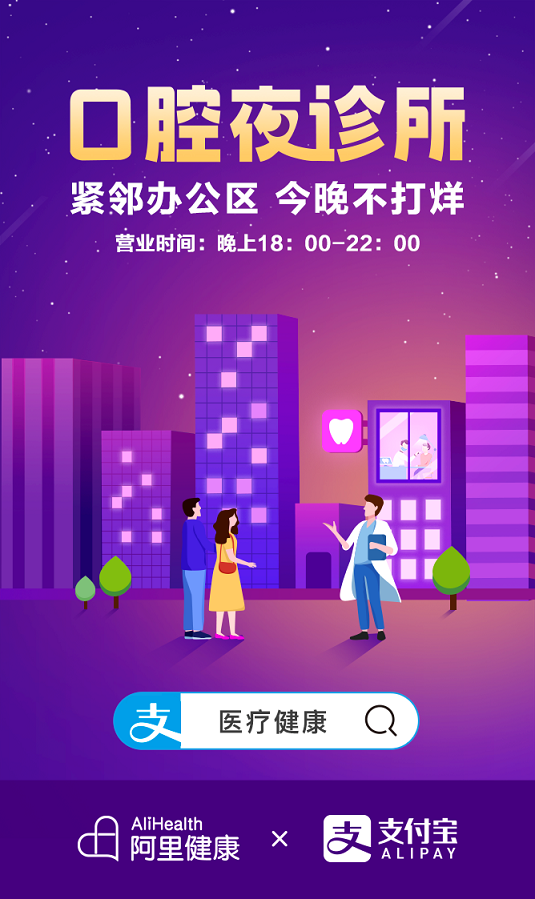 11月1日,阿里健康聯(lián)合支付寶于雙11前夕正式上線了口腔夜診所預約服務(wù)。消費者可以通過支付寶搜索關(guān)鍵詞“醫(yī)療健康”,在口腔健康頻道一鍵在線預約上海、北京、廣州、深圳、杭州、長沙、成都等22個城市的118家口腔診所的夜間診療服務(wù)(晚上18:00-22:00)。