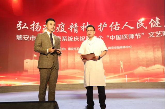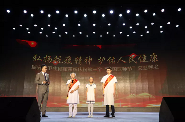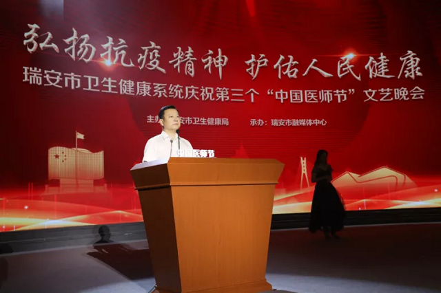 瑞安市衛(wèi)健局黨委書記、局長虞峰云在晚會(huì)上發(fā)表致辭,向全市廣大醫(yī)務(wù)工作者致以節(jié)日的問候。他表示,長期以來,全市衛(wèi)生與健康工作者堅(jiān)持以“人民健康為中心”的服務(wù)理念,恪守“健康所系,生命相托”的誓言,做了大量卓有成效的工作。特別是今年新冠肺炎疫情發(fā)生后,全系統(tǒng)廣大干部職工英勇無畏,沖鋒在前,同時(shí)間賽跑,與病魔較量,筑起護(hù)佑人民健康的堅(jiān)實(shí)防線,生動(dòng)詮釋了“敬佑生命、救死扶傷、甘于奉獻(xiàn)、大愛無疆”的崇高職業(yè)精神。他希望,全市衛(wèi)健人不忘初心、牢記使命,大力弘揚(yáng)抗疫精神,抓緊抓實(shí)抓細(xì)疫情防控各項(xiàng)工作,直至奪取抗擊疫情的全面勝利。