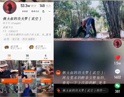 張繼坤在快手上注冊一個賬號,名叫“倆大叔的功夫夢(武空)(快手號:PGang001),專門用來發(fā)布他與師兄弟自拍自導(dǎo)的武打視頻,目前,他已在快手上發(fā)布了116個視頻,擁有54.1萬的粉絲量。張繼坤的視頻里,主要以武打為主,猴拳、洪拳、五郎八卦棍各路棍法、拳法應(yīng)有盡有。張繼坤的視頻里面偶爾會穿插一些小劇情,讓視頻顯得豐富生動。比如在猴拳的視頻中,化名為硬猴拳文彪的張繼坤與師兄王群一開場就是激烈的對打,打了一分多鐘,在張繼坤即將勝利的時候,王群突然拿出一根香蕉,原本暴躁的猴子張繼坤突然停下,接過香蕉吃起來。這樣突如其來的轉(zhuǎn)變讓很多網(wǎng)友哭笑不得,“這樣的小包袱嚇我一跳!薄按蚨肥昼,不如一根香蕉!碑(dāng)然也有網(wǎng)友只關(guān)注到武打的場面,“我仿佛又看到了十幾年前的武打片,沒有多余的特效!薄翱吹梦覠嵫序v。”“比絕大部份的電影和電視劇好看!边@個1分53秒的視頻,播出后獲得了10多萬的點贊和500多萬的播放量。