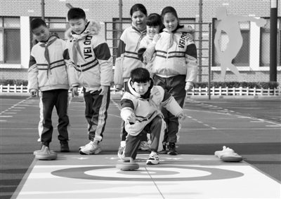 1月11日,青島市基隆路小學(xué)的同學(xué)們在體育課上練習(xí)旱地冰壺。
