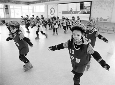 1月11日,青島市寧夏路小學(xué)的同學(xué)們在體育課上練習(xí)滑冰。