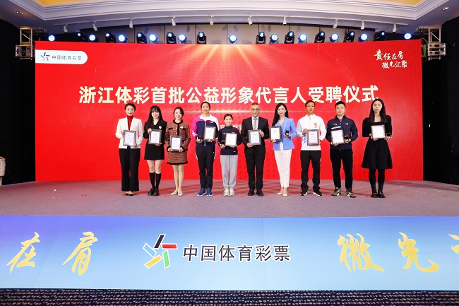 12位優(yōu)秀運動員和知名媒體人,受聘成為首批浙江體彩公益形象代言人,他們分別是體操奧運冠軍江鈺源,羽毛球世界冠軍王琳,中國大陸首位闖進(jìn)美網(wǎng)男單正賽球員吳易昺,帆船亞洲冠軍徐臧軍,男排亞洲冠軍張景胤,圍棋世界冠軍、職業(yè)九段檀嘯,女子圍棋全國冠軍、職業(yè)四段潘陽等7位優(yōu)秀運動員,以及浙江廣電集團(tuán)資深新聞評論員舒中勝、浙江之聲主持人思寧、浙江交通之聲主持人小白、浙江音樂調(diào)頻主持人果然、浙江經(jīng)視主持人楊琨等5位知名媒體人。