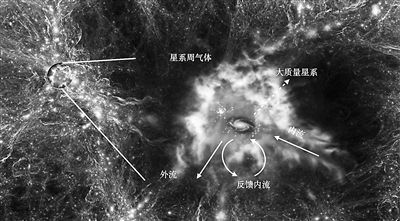 張世武進(jìn)一步解釋說,目前的觀測(cè)實(shí)驗(yàn)結(jié)果及理論模型認(rèn)為,在演化過程中,星系與其周圍環(huán)境密不可分。一方面,隨著恒星形成和星系中央超大質(zhì)量黑洞吸積物質(zhì),超新星爆發(fā)、活動(dòng)星系核反饋活動(dòng)等星系中的高能活動(dòng)會(huì)將星系中的重元素物質(zhì)拋射到大尺度環(huán)境系統(tǒng)中,形成星系外流。