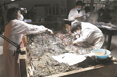 “像曾侯寶墓葬M168這樣的遺存,在野外環(huán)境下連續(xù)發(fā)掘4年幾乎不可能,尤其是其漆皮對空氣濕度非常敏感,它被從高濕度的淤土轉(zhuǎn)移到低濕度的空氣中時,很容易卷邊、起翹甚至脫落,影響發(fā)掘價值!敝炖谙蚩萍既請笥浾邚娬{(diào),“我們在實驗室里搭建了大棚,用工業(yè)加濕器、化學(xué)方法保濕,保證了漆皮的韌性和濕度,為發(fā)掘爭取了時間!