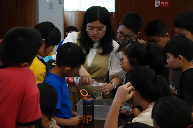 “在礦泉水瓶的不同高度扎幾個(gè)孔,往瓶?jī)?nèi)加滿水,從瓶子前方看,可以看到水射出的距離不相同,越低處的水,射出的距離越遠(yuǎn),這是什么原理呢?”科普課堂上,大學(xué)生黃纖纖通過(guò)實(shí)驗(yàn)演示,讓孩子們直觀感受壓強(qiáng)的應(yīng)用與影響壓強(qiáng)大小的因素。在她通俗易懂的語(yǔ)言中,科學(xué)課堂不僅充滿趣味,也有效啟發(fā)了孩子們對(duì)科學(xué)現(xiàn)象的思考。