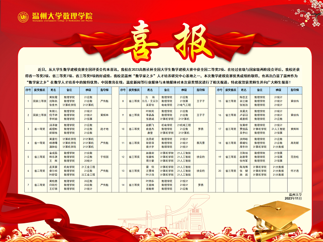 日前,從大學生數(shù)學建模競賽全國評委會傳來喜訊,溫州大學在2023高教社杯全國大學生數(shù)學建模大賽中獲全國二等獎2項。在經(jīng)過省級與國家級兩階段會評后,除以上2項全國二等獎,溫州大學還獲得省一等獎2項、省二等獎7項、省三等獎9項的好成績。