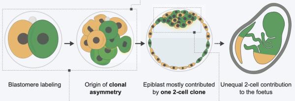在這項(xiàng)研究中,研究者們通過譜系追蹤技術(shù)(lineage tracing)來標(biāo)記和追蹤早期的胚胎細(xì)胞,發(fā)現(xiàn)受精卵分裂之初所形成的兩個(gè)細(xì)胞已經(jīng)具有不同的命運(yùn)——其中一個(gè)及其后代會(huì)形成內(nèi)細(xì)胞團(tuán)(Inner Cell Mass,ICM)并最終發(fā)育成胎兒,而另一個(gè)則會(huì)形成滋養(yǎng)外胚層(Trophectoderm, TE),最終發(fā)展成胎盤和一些胚胎外組織。
