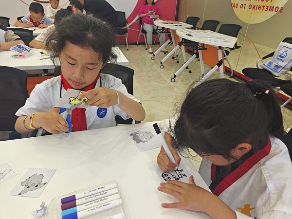 隨后,在公益老師的指導(dǎo)下,孩子們開始動(dòng)手制作自己的熱縮片鑰匙扣。選材、描圖、涂色、裁剪......孩子們積極動(dòng)手操作,相互討論,總結(jié)探索!拔业钠たㄇ鹞舶投伎炜床灰娏耍嫷臅r(shí)候不夠長,熱縮片縮小后就顯得更短了。”二年級的易伊提醒小伙伴們要考慮熱縮片縮小后圖形變化;“我觀察后發(fā)現(xiàn)吹熱縮片要從外面一圈一圈地慢慢往中間吹,最后再用板壓平!本妥x三年級的陳雨則發(fā)現(xiàn)了吹熱縮片時(shí)的小技巧。小朋友們你一言我一語分享訣竅,糾正錯(cuò)誤,相互幫助,再一次動(dòng)手的時(shí)候,看著一個(gè)個(gè)精美的鑰匙扣,成就感滿滿。