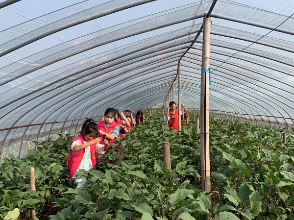 在幫扶戶(hù)的蔬菜大棚內(nèi),身穿紅馬甲的小朋友們,在了解了大棚茄子的基本知識(shí)及采收注意事項(xiàng)后,小心翼翼地摘下一個(gè)個(gè)成熟的茄子。小朋友們埋頭細(xì)心勞作,懂得了“誰(shuí)知盤(pán)中餐,粒粒皆辛苦”的含義。