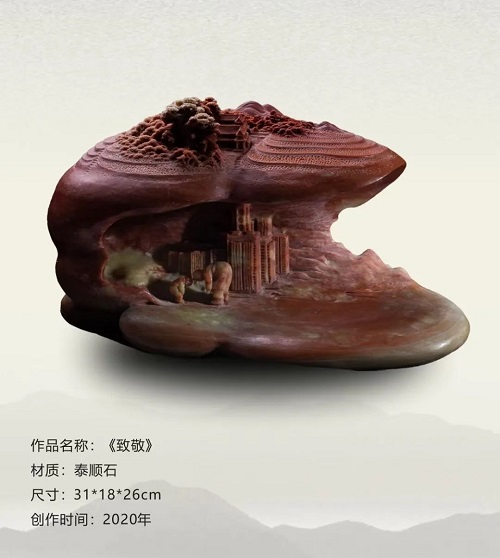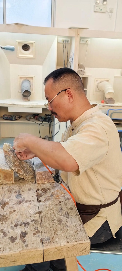 在潘成松眼中,石頭絕非普通的材質(zhì),而是承載著無限可能的藝術(shù)寶藏,是匠心獨(dú)運(yùn)的結(jié)晶。潘成松說,“我喜愛石頭,它是超億年‘歲月見證者’。億萬年中,地殼運(yùn)動、風(fēng)雨打磨,石上蝕痕訴說地球變遷。我以雕刀,助石頭重綻光芒、回歸自然之美,這是我矢志不渝的追求!