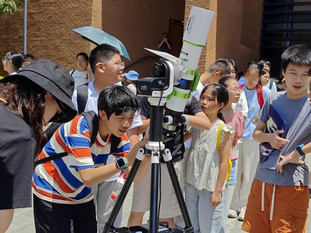 海曙外國語學(xué)校老師顧勤華推出了最新型的專業(yè)日珥鏡。孩子們像小麻雀似的圍上去,分組輪流看太陽!疤炷模√柹嫌泻邳c(diǎn)!”一個(gè)扎羊角辮的女孩踮著腳喊!跋袂煽肆Φ案馍系袅它c(diǎn)芝麻!”“哇——太陽真的長耳朵!”孩子們在操作中學(xué)會(huì)觀察、學(xué)會(huì)思考,這正是科學(xué)探究的起點(diǎn)。