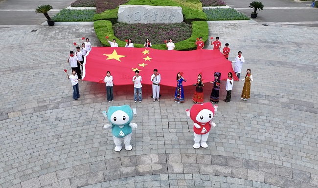 南操場上,12米長的巨幅國旗是最莊重的“青春告白”。數(shù)十名學生牽手,小心翼翼地牽引著鮮紅的旗幟緩緩展開,陽光灑在國旗上,也映在每個人肅穆的臉龐。“指尖觸到國旗的那一刻,突然懂了‘守護’的重量!眳⑴c舉旗的同學皮慧方說。不遠處,國旗護衛(wèi)隊成員身著軍裝,邁著鏗鏘步伐開展升國旗、踢正步訓(xùn)練,挺拔的身姿盡顯擔當。學生代表身著“青春為中國式現(xiàn)代化挺膺擔當”的T恤,字字鏗鏘喊出報國志,各民族學子穿特色服飾舉小國旗齊唱祝!,F(xiàn)場師生紛紛感慨:“不同的模樣,同樣的愛國心!”