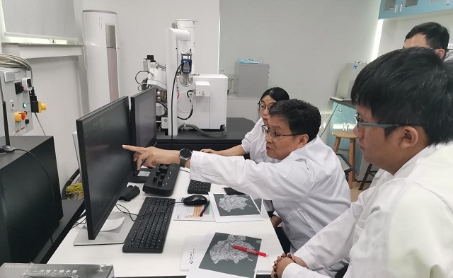 2024年8月26日,徐義剛院士與團隊成員通過掃描電鏡觀察嫦娥六號樣品特征。(中國科學(xué)院廣州地球化學(xué)研究所供圖)