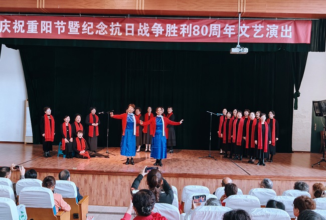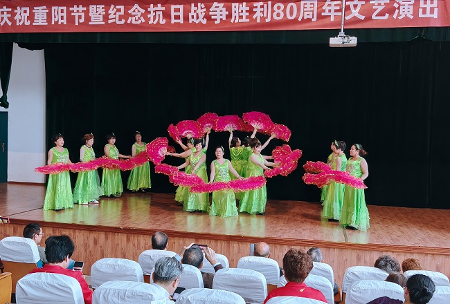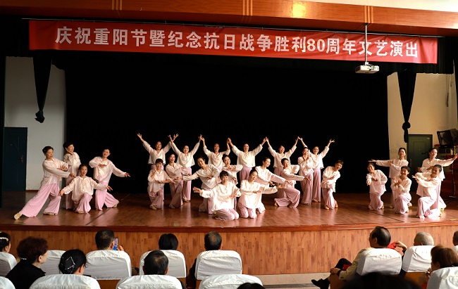 演出以“敬老”與“抗戰(zhàn)”為核心主線,節(jié)目內(nèi)容包括大合唱、舞蹈、戲曲、太極、腰鼓、旗袍秀等,不少節(jié)目融入了紅色經(jīng)典元素與敬老溫情,兼顧思想性與觀賞性,贏得觀眾熱烈掌聲。