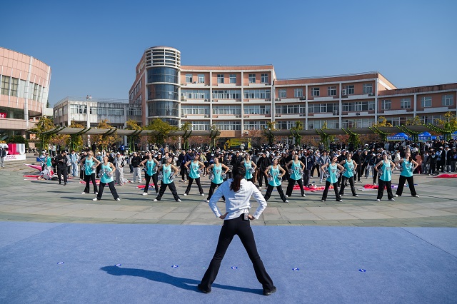 街舞協(xié)會、校啦啦操隊、校武術隊輪番上場,贏得全場師生陣陣掌聲。作為本次活動的亮點環(huán)節(jié),“悅動?青春”廣場舞環(huán)節(jié)將氛圍推向高潮。近千名師生以學院為單位列隊,在專業(yè)教練的帶領下,隨著明快的節(jié)奏舒展肢體、盡情舞動。啟明廣場上,躍動的身影和歡快的旋律交織成一片活力海洋,成為釋放學業(yè)壓力、激揚青春活力的生動載體。“原來廣場舞能這么潮!每一次伸展都是對疲憊的告別,每一次跳躍都是對壓力的宣戰(zhàn)!”人文與外語學院學生孟弋琳激動地說。