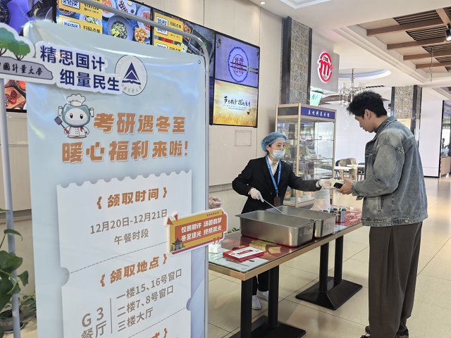 考試期間恰逢冬至,為了讓考生感受到“家”一般的溫暖,學(xué)校特意準備了一份小驚喜:后勤服務(wù)中心在餐廳開設(shè)助考專窗,考生憑準考證即可免費領(lǐng)取一份湯圓或水餃。這讓浙江財經(jīng)大學(xué)張同學(xué)倍感暖心:“味道很好,六顆湯圓還寓示著‘六六大順’,學(xué)校的這份用心我接收到了!