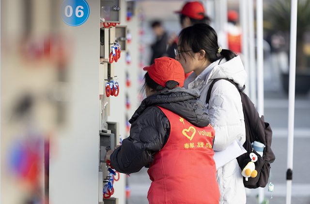 學(xué)校精心布設(shè)暖心服務(wù)點、志愿者咨詢臺及應(yīng)急綠色通道,全方位為考生保駕護航?紙鐾馇逦涯康闹敢龢俗R一目了然,志愿者與研究生會干部主動為考生提供咨詢引導(dǎo)服務(wù),并協(xié)助考生將手機等隨身物品統(tǒng)一存放至指定區(qū)域!皬乃⒛樳^安檢開始,就有志愿者微笑著對我說‘加油’,老師們也不斷給予我鼓勵,一路上都有工作人員耐心指引!敝袊嬃看髮W(xué)考生王雅玲說,這些小小的善意,給了她很大的鼓勵。