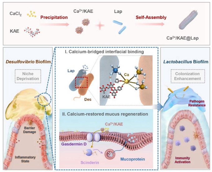 重構(gòu)腸道生態(tài)位是清除脫硫弧菌菌膜并實(shí)現(xiàn)益生菌定植的必要條件,需要有針對(duì)性地增強(qiáng)微生物-宿主的串?dāng)_,以占據(jù)現(xiàn)有的生態(tài)位并重塑代謝微環(huán)境,以產(chǎn)生新的生態(tài)位。顧青教授團(tuán)隊(duì)設(shè)計(jì)構(gòu)建了一種瞄準(zhǔn)定植位點(diǎn)搶占與重塑的菌膜轉(zhuǎn)換策略,利用鈣離子(Ca2+)和天然鈣調(diào)節(jié)成分KAE對(duì)脫硫弧菌拮抗型乳酸桿菌(Lap)進(jìn)行修飾(Ca2+/KAE@Lap),與傳統(tǒng)僅選擇黏附性生物聚合物或小分子以增強(qiáng)益生菌與宿主腸道組分互作的策略相比,這種修飾的益生菌系統(tǒng)利用了鈣介導(dǎo)的雙重腸道機(jī)制:一方面,Ca2+作為陽(yáng)離子介質(zhì),能夠與脫硫弧菌菌膜陰離子官能團(tuán)及乳酸桿菌表面配體間形成離子及配位鍵,這種Ca2+依賴性橋接強(qiáng)烈增強(qiáng)了脫硫弧菌-乳酸桿菌的結(jié)合親和力,從而能夠靶向殺傷脫硫弧菌及釋放生態(tài)位;另一方面,KAE激活腸上皮細(xì)胞上的鈣通道,促進(jìn)Ca2+內(nèi)流以抵消脫硫弧菌引起的鈣抑制,從而恢復(fù)依賴鈣的黏液層重塑,并補(bǔ)充減少的結(jié)合位點(diǎn)。這一鈣驅(qū)動(dòng)的“原位替代-黏液層重塑”行為,能夠有效轉(zhuǎn)換腸道脫硫弧菌菌膜為乳酸菌菌膜,實(shí)現(xiàn)益生菌的穩(wěn)定定植。