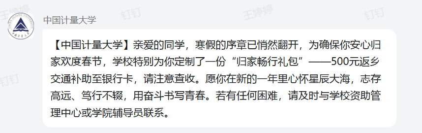 歲末寒冬,返鄉(xiāng)在即。近期,中國計量大學(xué)為家庭經(jīng)濟(jì)困難學(xué)生發(fā)放“寒假返鄉(xiāng)路費(fèi)補(bǔ)貼”,用“量大暖”的育人溫度,護(hù)航學(xué)子溫暖返鄉(xiāng)。