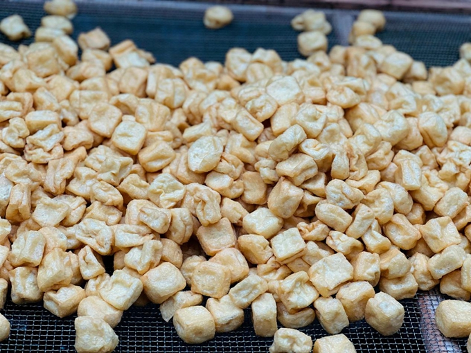 寒冬早晨,宣平豆腐工坊內(nèi)熱氣蒸騰,油香四溢。坊主陳小明正將切好的豆腐塊滑入油鍋,伴隨著“滋啦”聲響,豆腐在熱油中翻滾膨脹,短短幾分鐘,實(shí)心的豆腐塊神奇般化為金黃飽滿、外酥里空的豆腐泡!澳昵白蠲Φ臅r(shí)候,光豆腐泡一天就能賣出近百斤!标愋∶餍χ鴮(duì)前來(lái)走訪的民泰銀行武義支行客戶經(jīng)理說(shuō)。