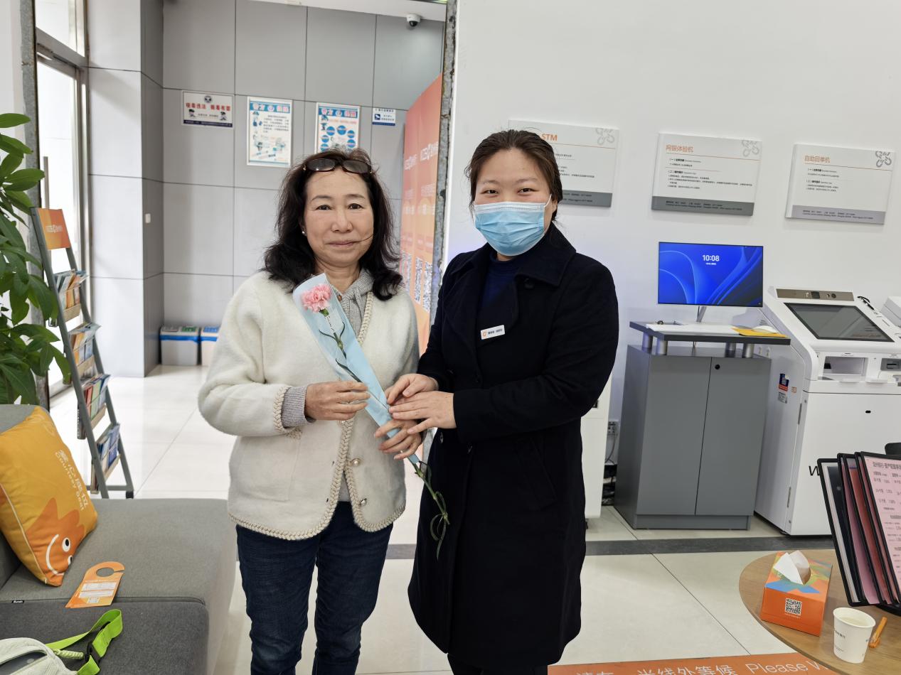 在鹿城七都支行,一場別出心裁的“蔬”送美好活動吸引了眾多社區(qū)居民駐足。支行在門口擺起愛心攤位,工作人員將一束束翠綠鮮嫩、用彩紙精心包裝的西蘭花遞到過往女性手中。西蘭花寓意“健康常伴”,既傳遞了綠色健康的生活理念,又巧妙拉近了支行與社區(qū)居民的距離!捌匠6际鞘彰倒寤ǎ裉焓盏轿魈m花,既好看又能做菜,真是太有心了!”一位阿姨接過花束,臉上洋溢著驚喜的笑容。